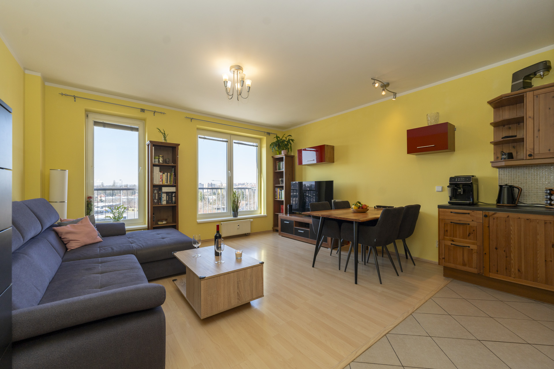 Dominantou bytu je prostorný obývací pokoj s kuchyňským koutem orientovaný na západ, což oceníte především v odpoledních hodinách po návratu z práce. Ložnice je orientovaná na sever, díky tomu nabízí klidné a příjemné prostředí pro nerušený spánek. Součástí bytu je také sklep (2 m²) a další velkou výhodou je garážové stání umístěné v blízkosti výtahu.