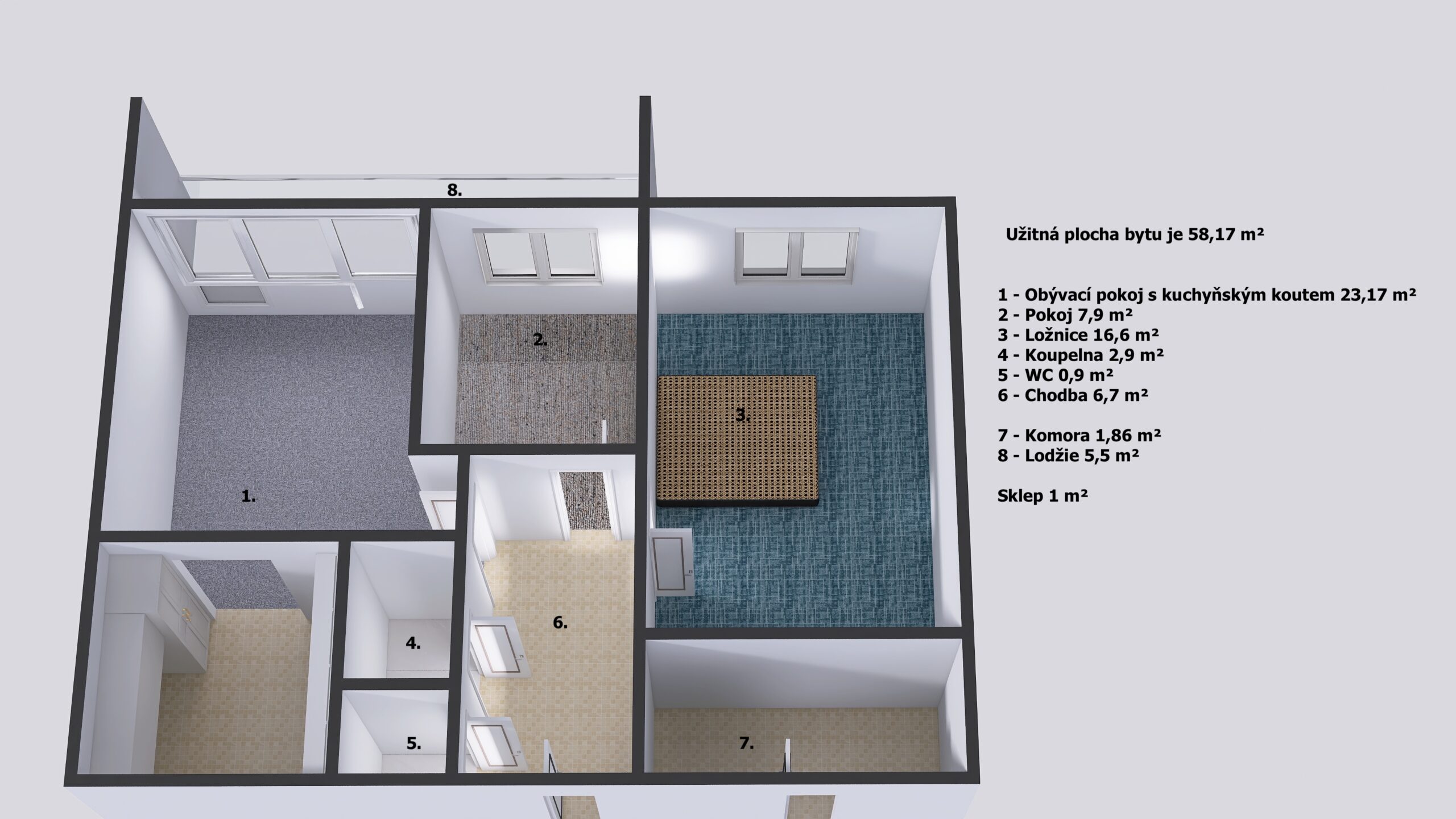 K bytu patří také lodžie o velikosti 5,5 m², ideální pro odpočinek u knížky nebo večerní posezení. K bytu dále náleží komora o velikosti 1,86 m2, která se nachází hned vedle bytu (celková podlahová plocha bytu je 60 m2) a sklepní kóje (1 m2) v přízemí domu.