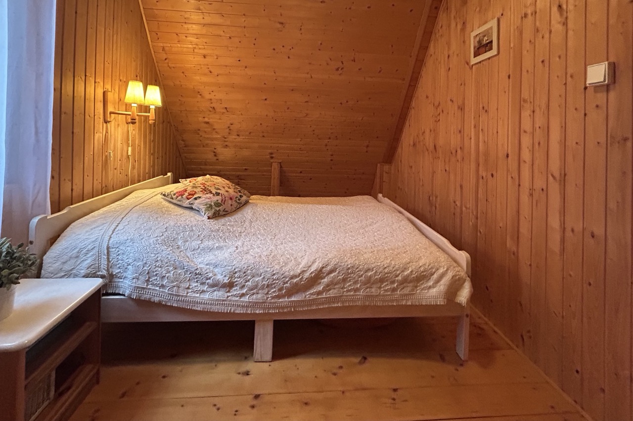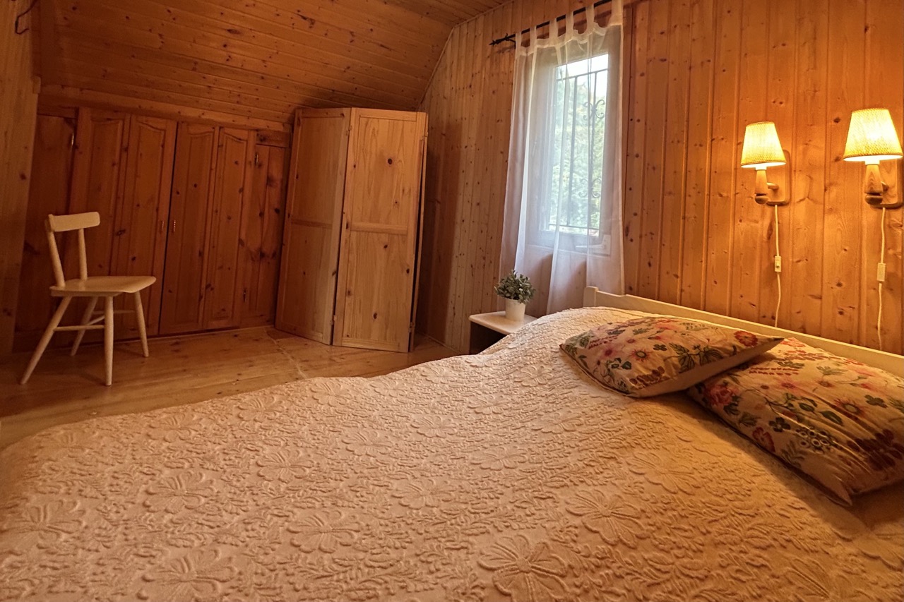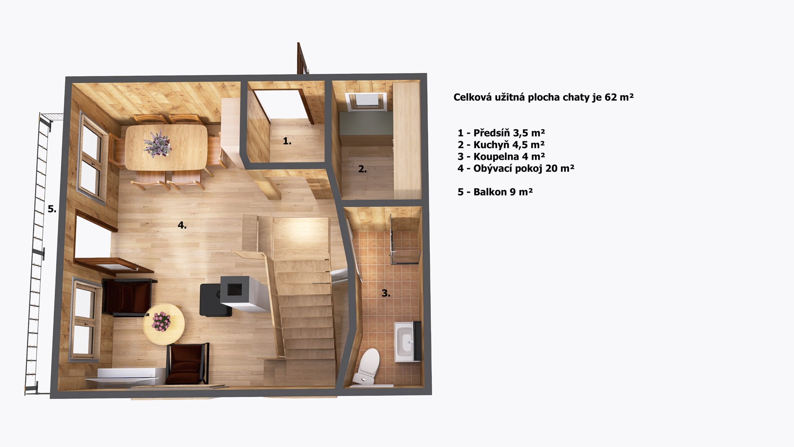 Chata o dispozici 3+1 a užitné ploše 62 m² má útulnou atmosféru, kterou si okamžitě zamilujete. Vytápění zajišťují krbová kamna, o teplou vodu se stará elektrický bojler, voda je čerpána z vlastní studny vybudované v roce 1992. Elektřina je v mědi a střecha z kanadského šindele z roku 1992 je stále ve velmi v dobrém stavu.