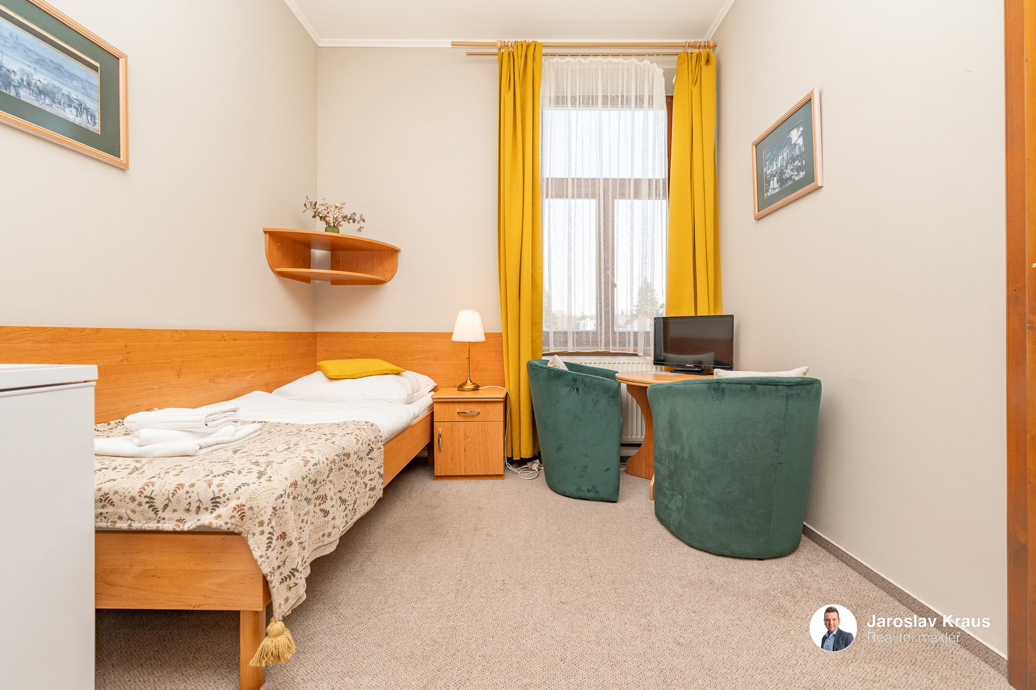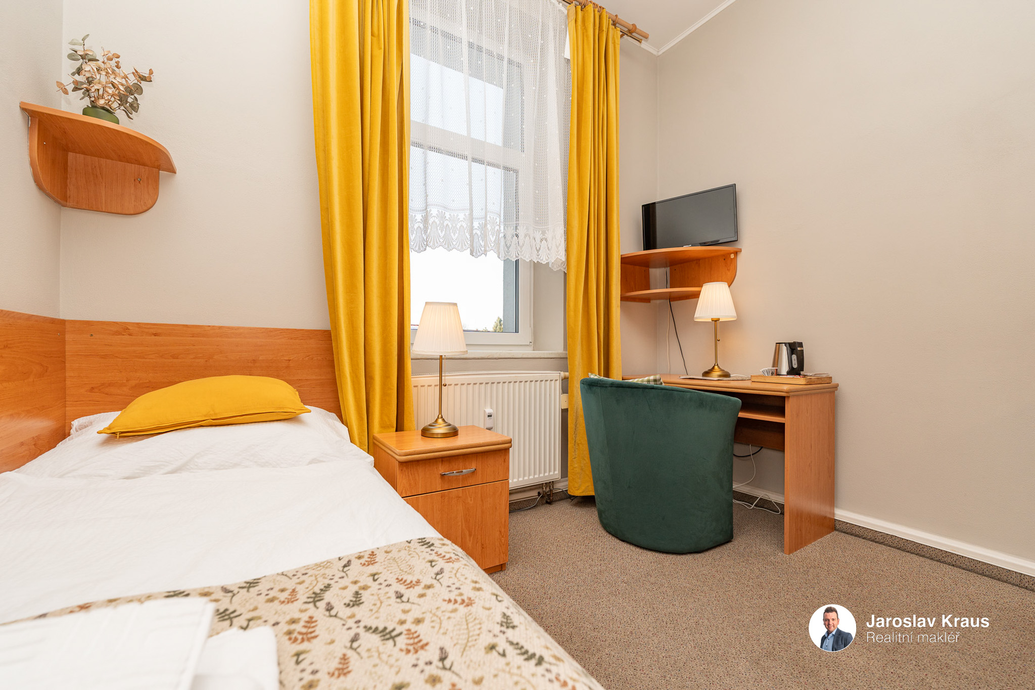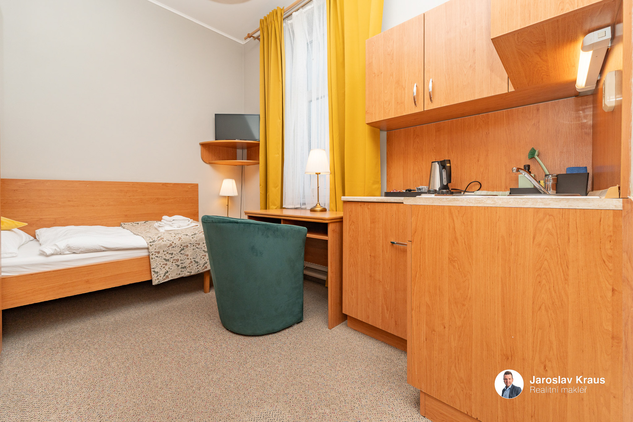 1 lůžkový pokoj s kuchyňským koutem a vlastní koupelnou má dispozici 1+kk a jeho užitná plocha je 14,8 m2.