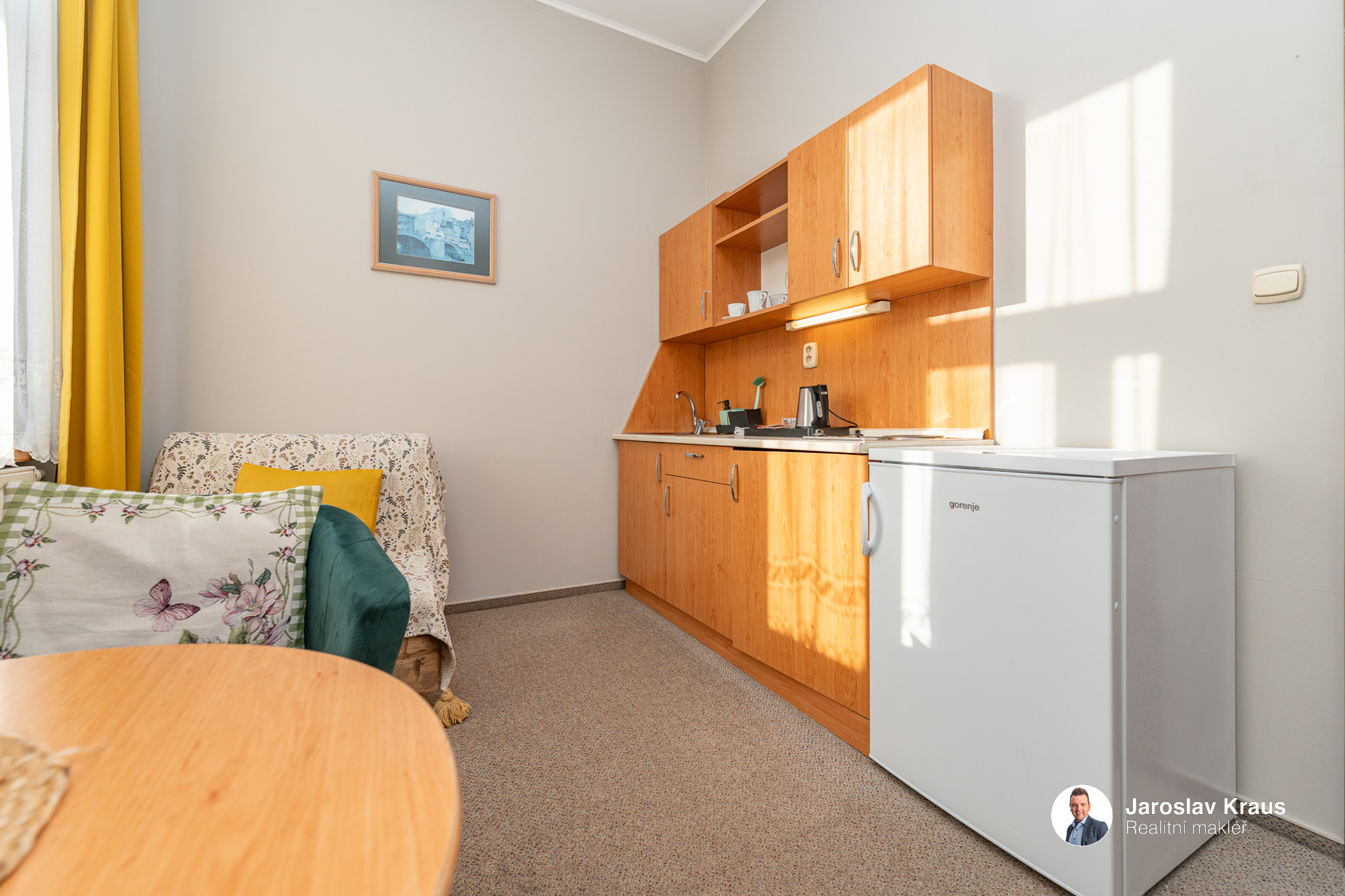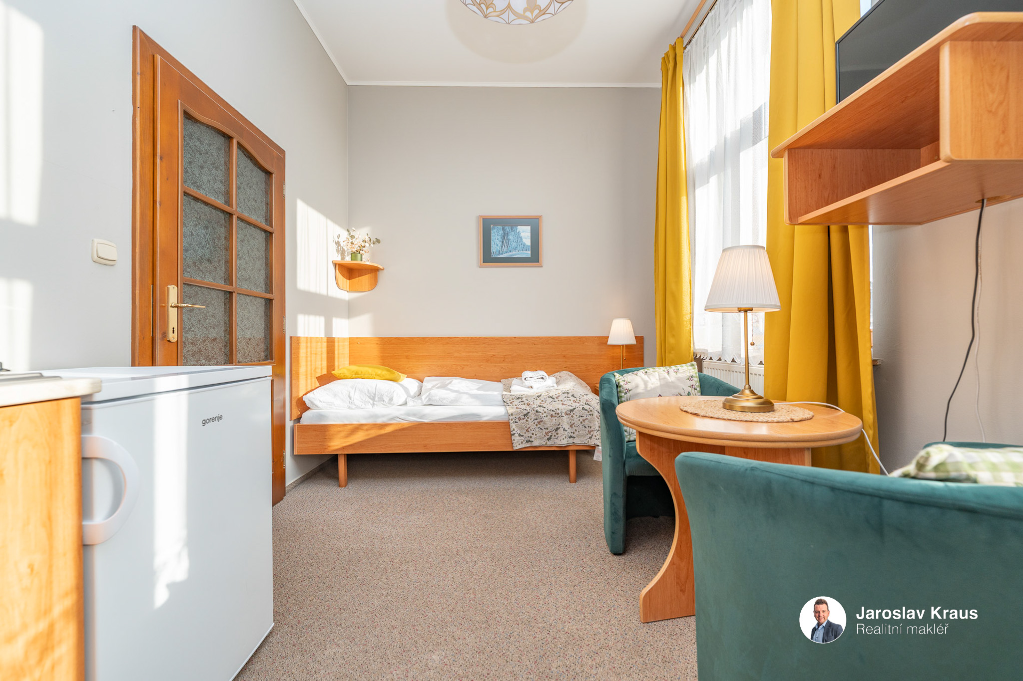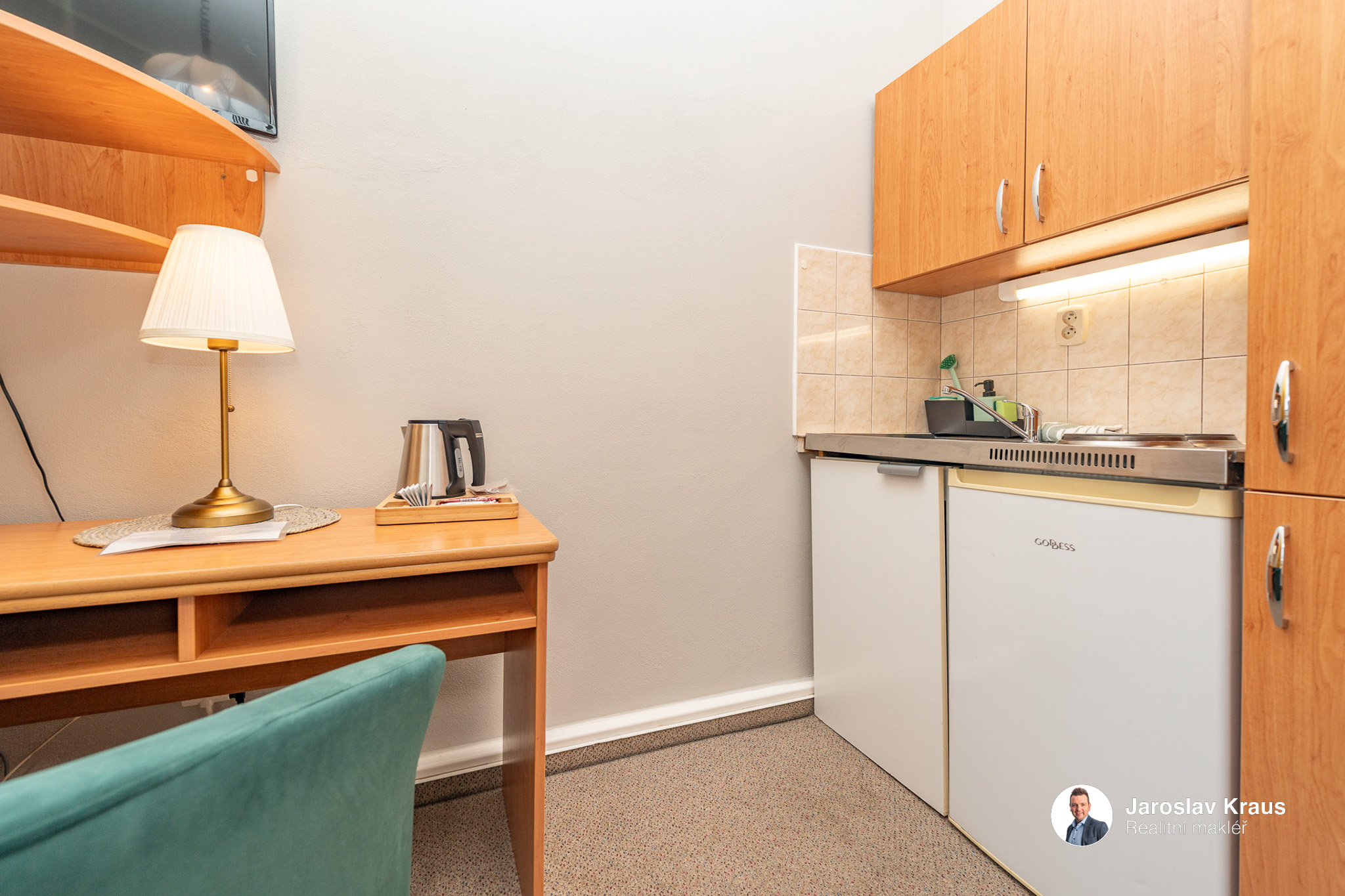 1 lůžkový pokoj s kuchyňským koutem a vlastní koupelnou má dispozici 1+kk a jeho užitná plocha je 14,8 m2.