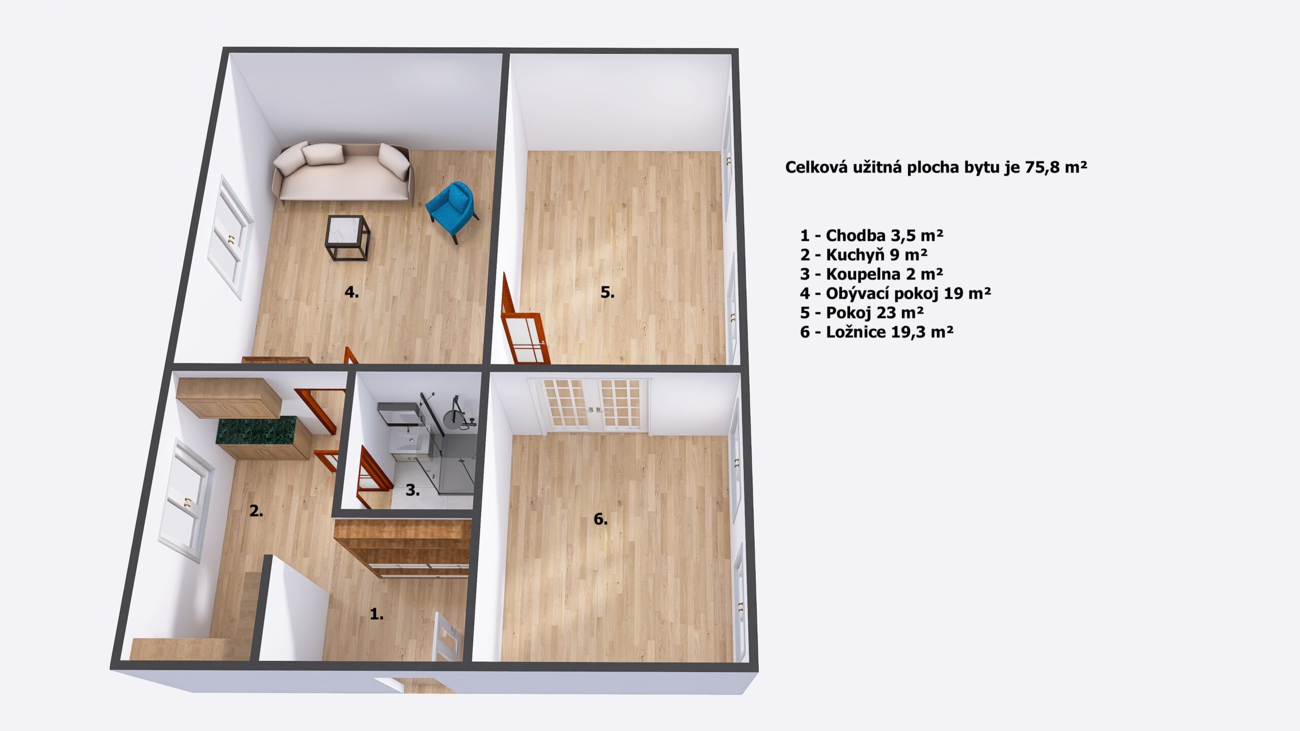 Byt o velikosti 75,8 m² se nachází v přízemí domu a potěší svou příjemnou atmosférou i praktičností. Každá místnost má dostatek světla a prostoru, aby si tu svůj kout našel každý člen rodiny.