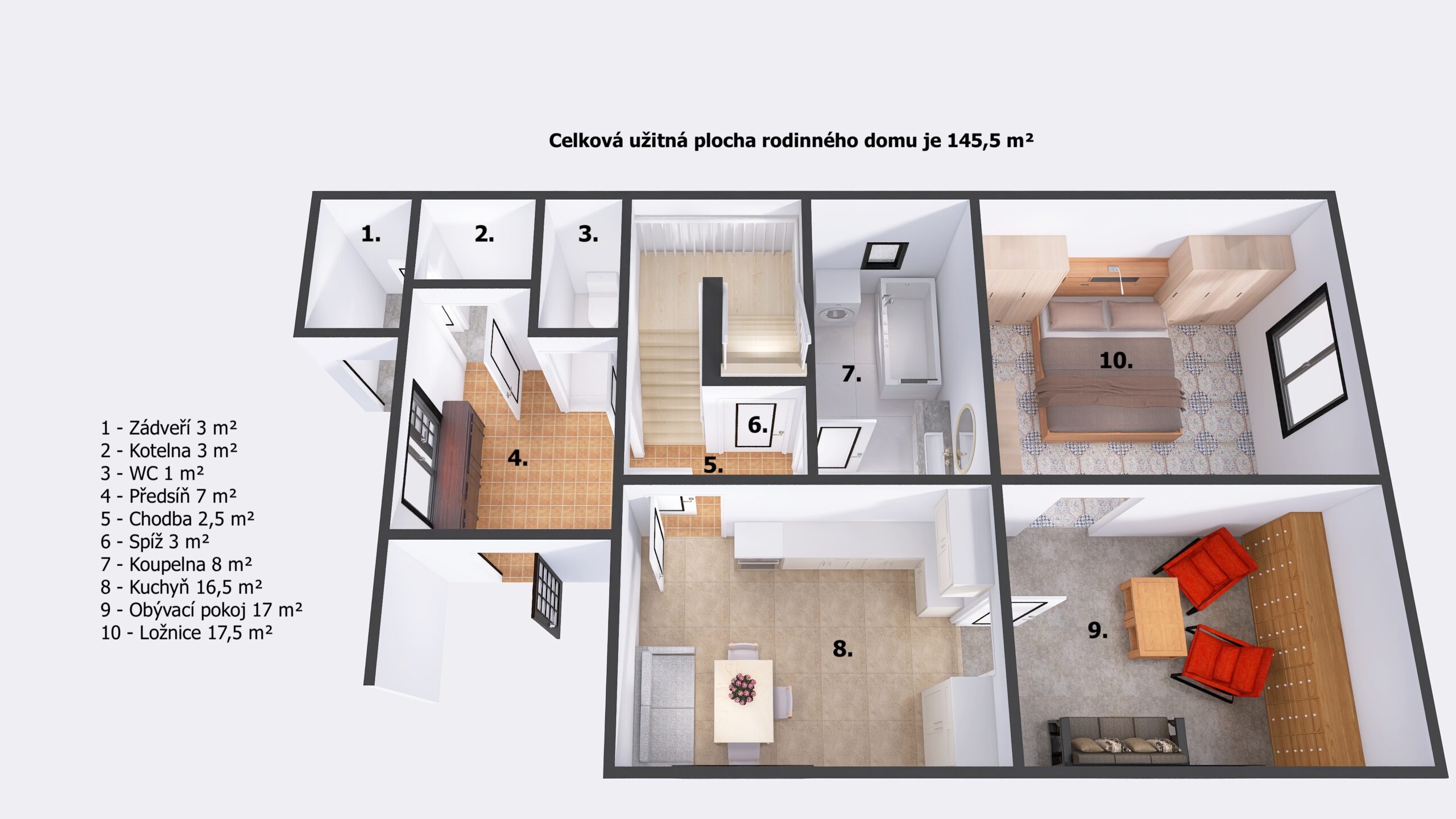 Dvoupodlažní cihlový dům z roku 1968 stojí na prostorném pozemku o velikosti 1 289 m². Užitná plocha domu je 145,5 m² a nabízí promyšlenou dispozici 5+1, která poskytne dostatek soukromí i společného prostoru pro setkávání s rodinou a přáteli.
