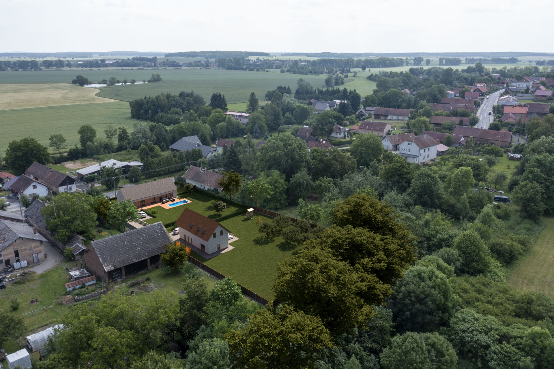 Součástí prodeje je projekt moderního dvoupodlažního domu s dispozicí 5+kk a užitnou plochou 123 m². Návrh počítá s nízkými provozními náklady a šetrností k přírodě. Na pozemku je zajištěna přípojka elektřiny, možnost napojení na obecní vodovod a příjezdová cesta je v osobním vlastnictví.