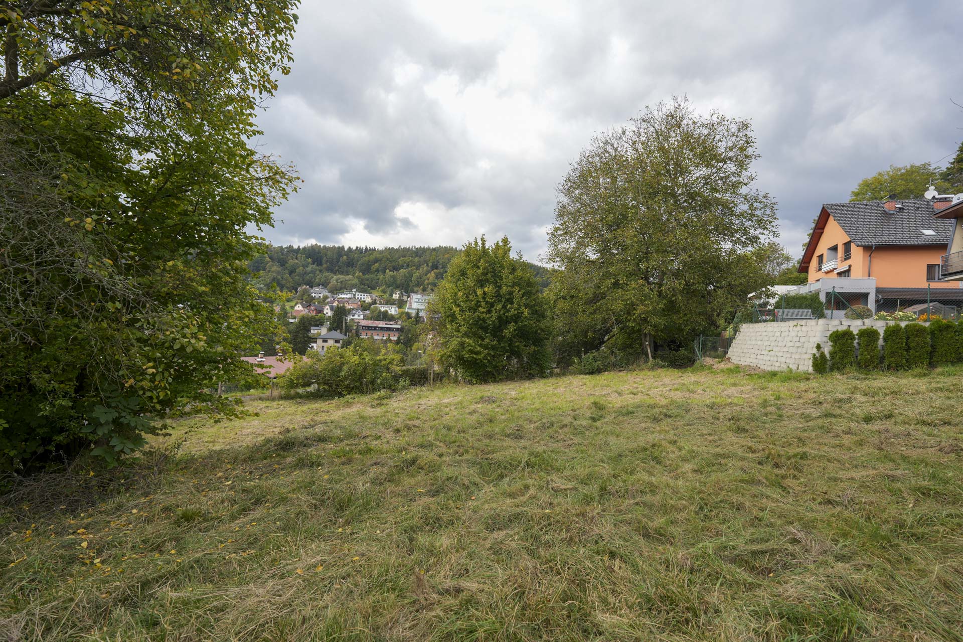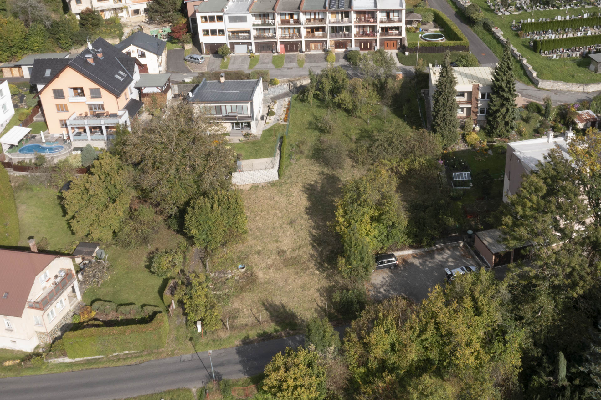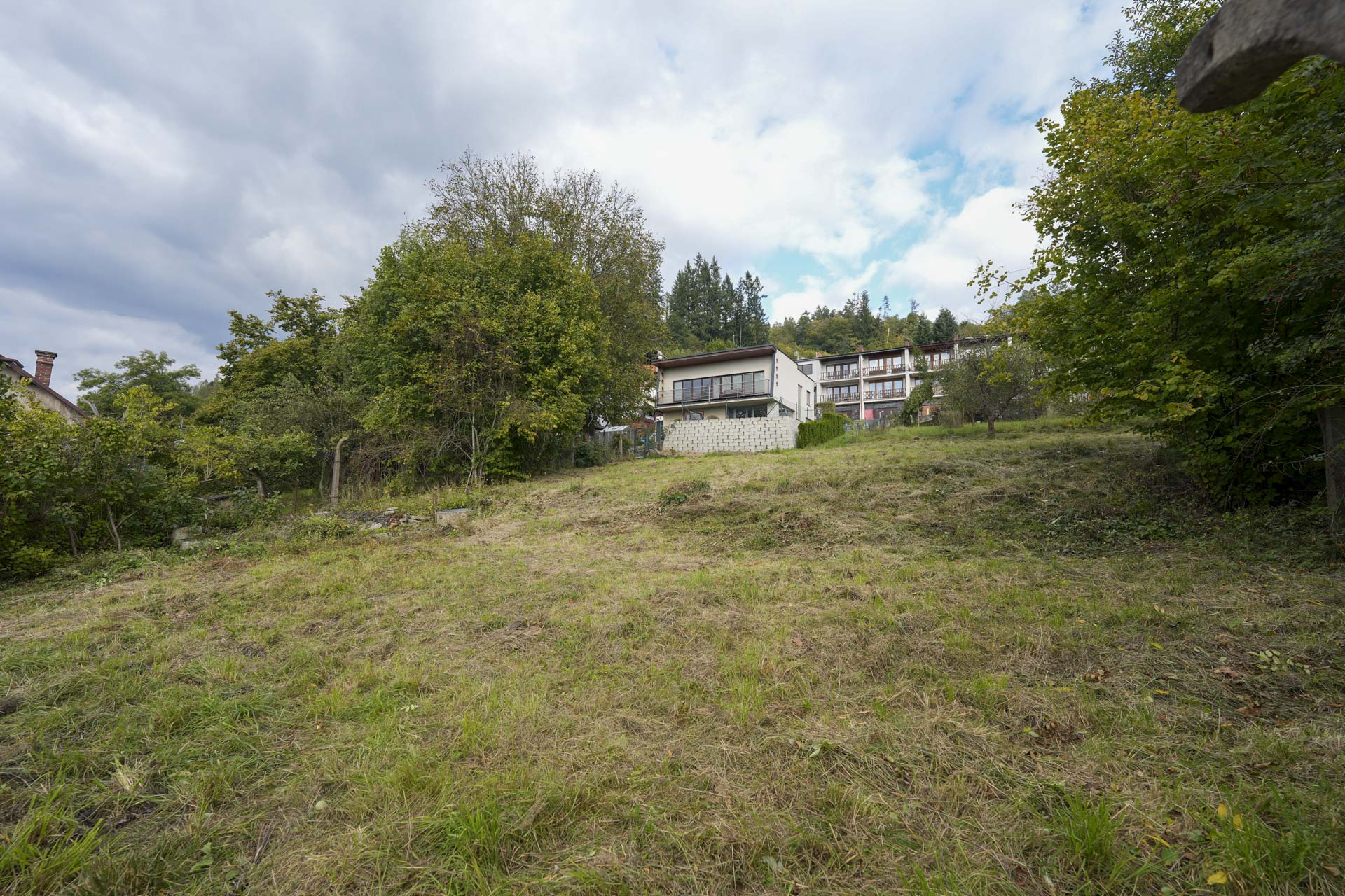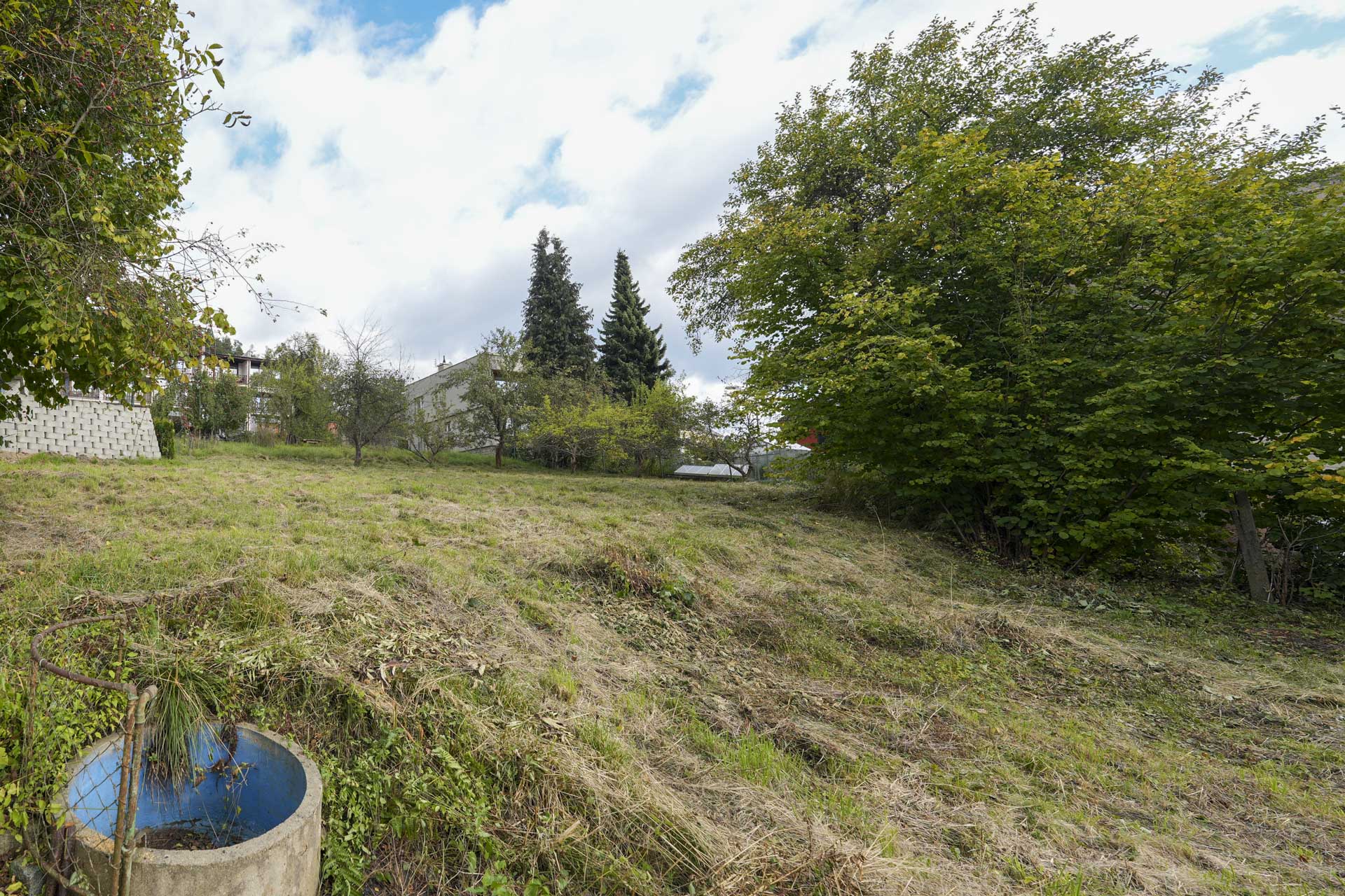 Při silnici je rovná část pozemku vhodná pro parkování, za ní se pozemek mírně zvedá směrem k jihozápadu a nabízí krásný výhled na protější část města. Na kraji pozemku rostou ovocné stromy, které dotvářejí jeho poklidnou atmosféru.