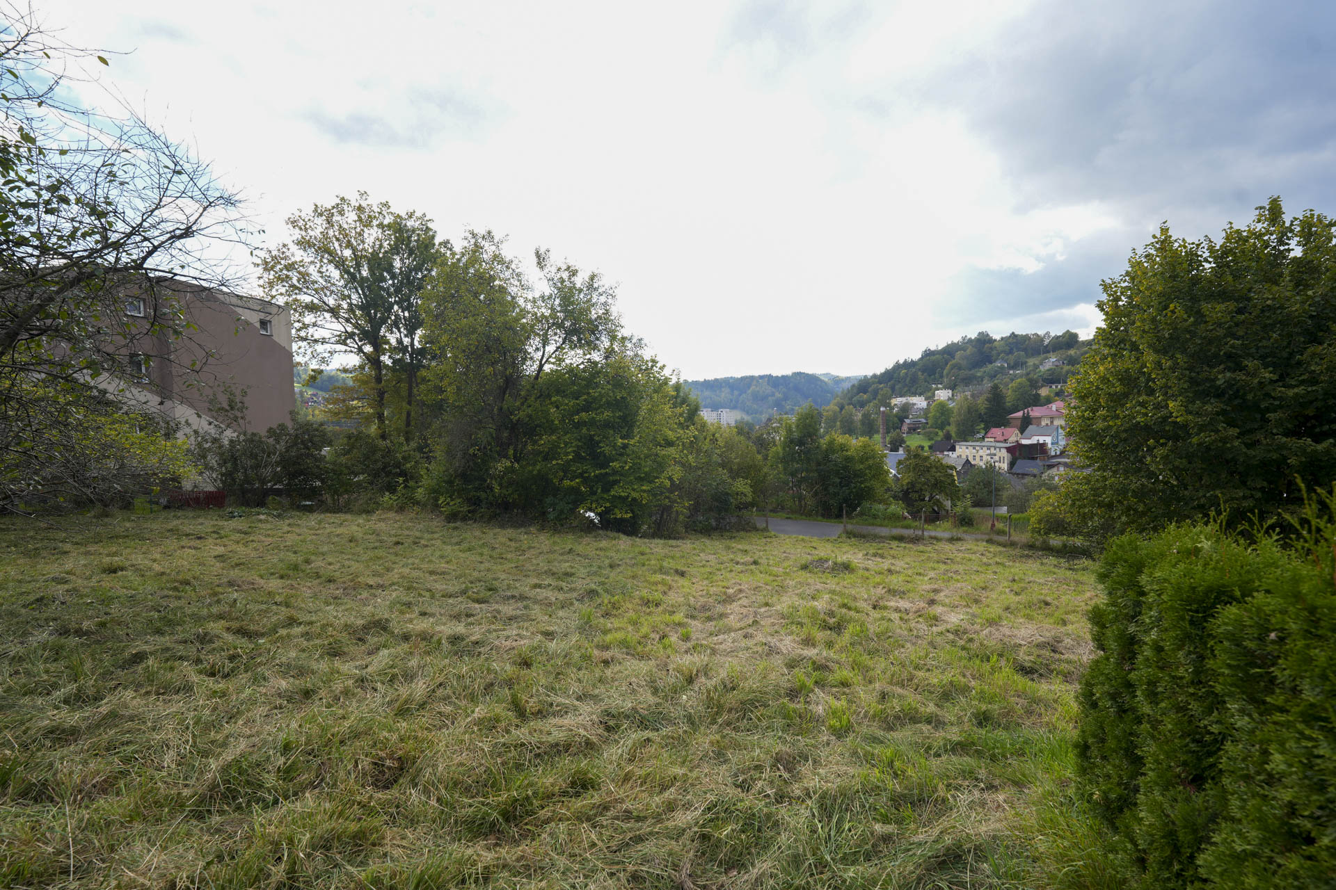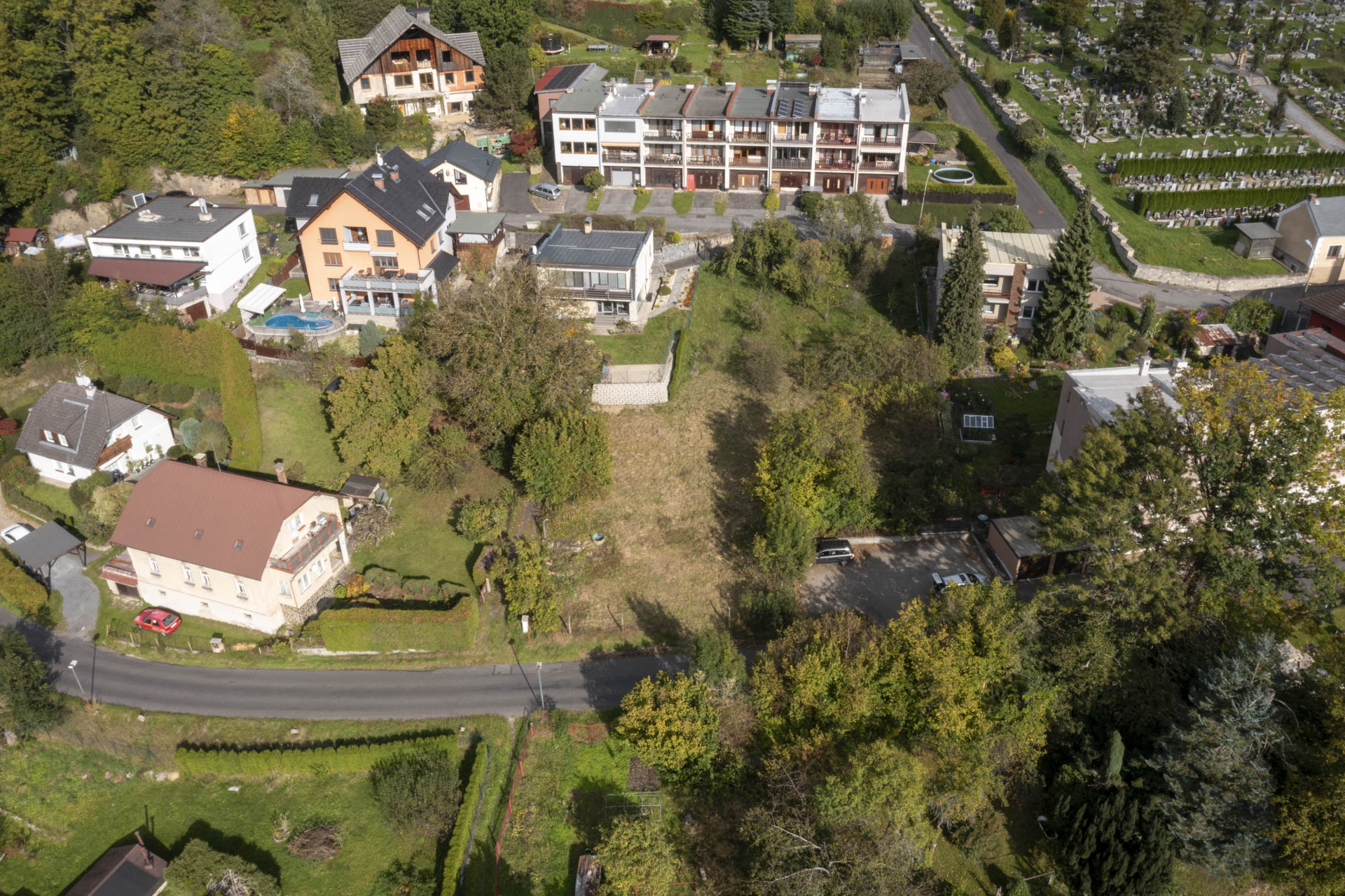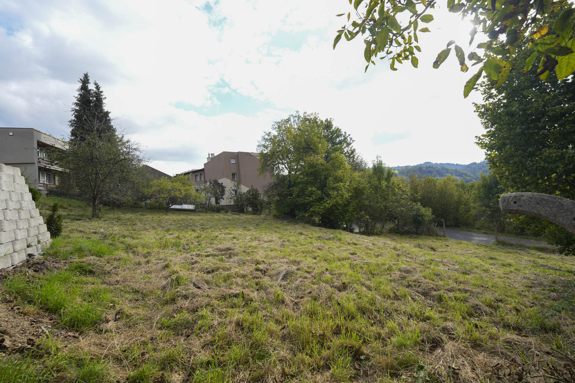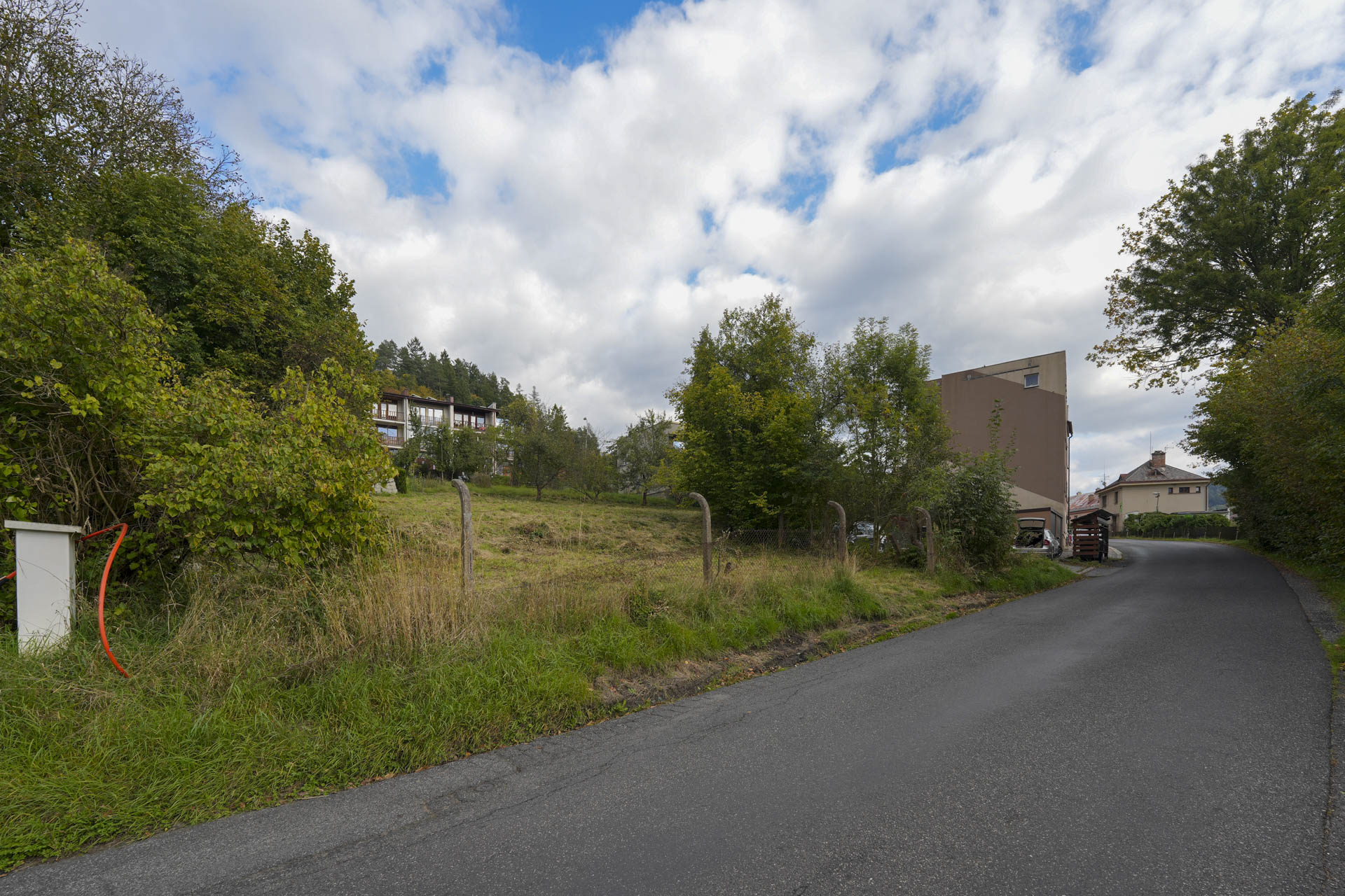 Při silnici je rovná část pozemku vhodná pro parkování, za ní se pozemek mírně zvedá směrem k jihozápadu a nabízí krásný výhled na protější část města. Na kraji pozemku rostou ovocné stromy, které dotvářejí jeho poklidnou atmosféru.